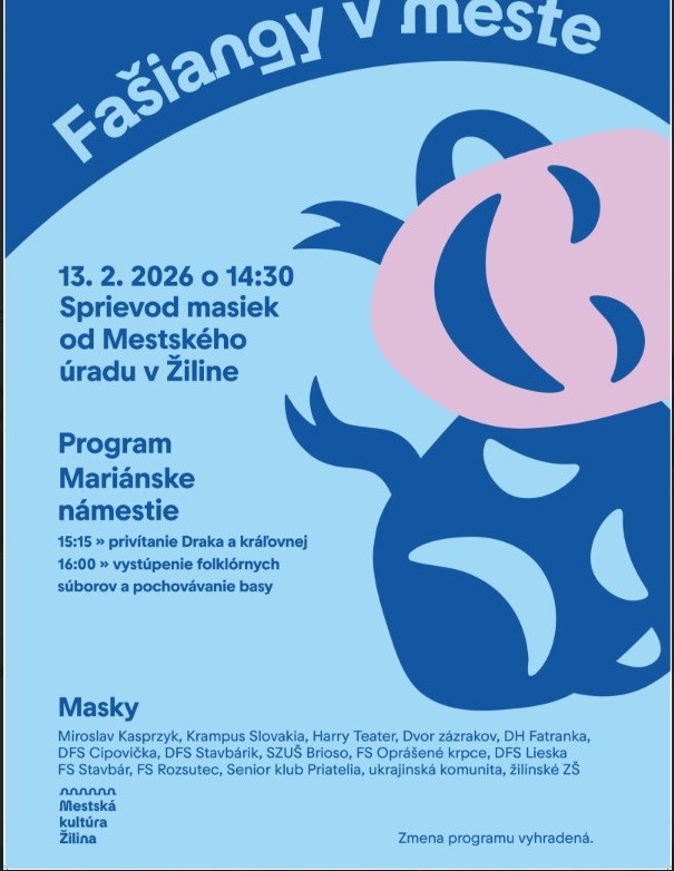 Fašiangy v meste odštartuje sprievod fašiangových masiek, ktorý do ulíc Žiliny vnesie zábavu plnú hudby a tanca. Okrem profesionálnych súborov budú jeho súčasťou aj žiaci základných škôl, klub seniorov či ukrajinská komunita. „V sprievode sa predstavia kreatívne masky, ktoré sú výsledkom tradície, aj súčasnej ľudskej fantázie. Po príchode na Mariánske námestie bude sprievod oficiálne vítať drak a kráľovná. Nebudú chýbať vystúpenia obľúbených folklórnych súborov Stavbár, Rozsutec, Oprášené krpce, detských folklórnych súborov Cipovička, Stavbárik a ďalších účinkujúcich, ktorí svojimi piesňami dotvoria tú správnu atmosféru. Vyvrcholením podujatia bude pochovávanie basy symbolizujúce rozlúčku s fašiangami a prípravu na pôstne obdobie. Verím, že si pripravený program nájde miesto v plánoch Žilinčanov a prídu sa spoločne s rodinami, priateľmi, známymi zabaviť do centra mesta a pripomenúť si túto milú tradíciu,“ uviedol primátor Žiliny Peter Fiabáne.